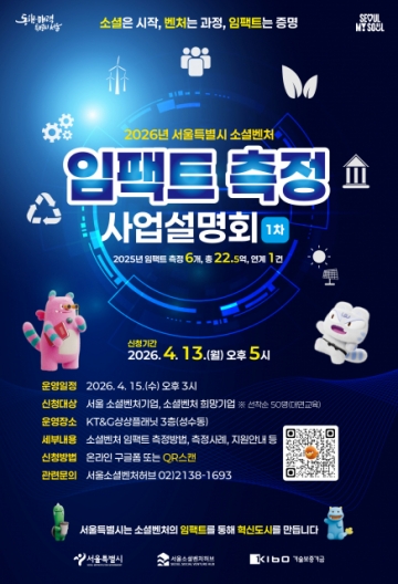 서울소셜벤처허브가 서울시 소재 소셜벤처기업의 경쟁력 강화와 지속 가능한 사회적 가치 창출을 지원하기 위해 ‘2026년 서울시 소셜벤처 임팩트 측정 사업설명회(1차)’를 개최한다.