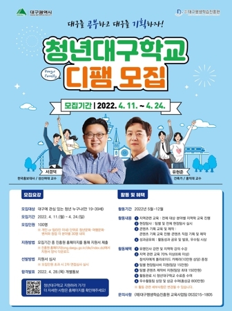 [가람플러스] 대구시와 대구평생학습진흥원은 지역학 교육과 지역탐사로 청년들에게 지역에 대한 종합적인 이해와 경험을 제공해, 대구에 대한 가치 재발견 및 긍정적 인식확대로 지역 정주의향을 제고하고자 ‘2022 청년대구학교’에 참여할 참가자를 4월 11일부터 4월 24일까지 공개 모집한다.