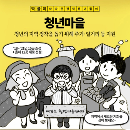 2018년도부터 2021년까지 전국 각지에 15곳의 청년 마을이 조성되었고 올해는 12곳이 새롭게 선정됐어요. 새롭게 선정된 12곳은 △강원 속초시·태백시·영월군 △충남 아산시·태안군 △전북 군산시 △전남 강진군 △경북 경주시·의성군·예천군 △경남 하동군·함양군이에요.