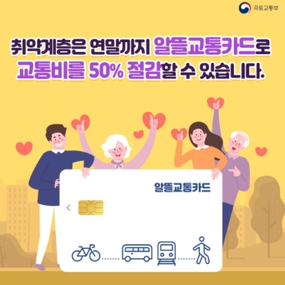 - 알뜰교통카드로 대중교통 이용 시, 대중교통비를 최대 50%(기존 최대 38%)까지 절감 가능
