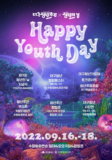청년이 직접 기획하고 참여해 만들어가는 청년 축제인 ‘대구청년주간’은 올해 8번째로 개최되며, ‘해피 유스 데이(Happy Youth Day)’라는 슬로건 아래 청년을 축하하는 자리로 마련된다. 수창청춘맨숀, 대구예술발전소 일대와 대구 전역 청년공간에서 대면 행사로 진행될 예정이다.