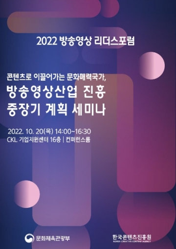 [가람플러스] 문화체육관광부는 한국콘텐츠진흥원과 함께 10월 20일, 콘텐츠코리아랩(CKL) 기업지원센터(서울 중구)에서 ‘제6차 방송영상산업 진흥 중장기계획’을 수립하기 위한 3차 현장 토론회를 열고 문화매력국가 도약을 위한 방송영상산업의 미래 전략을 논의한다.