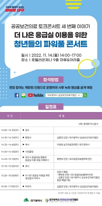 [가람플러스] 대구시는 대구시 공공보건의료지원단과 함께 11월 14일 오후 2시, 호텔라온제나(수성구 범어동)에서 ‘공공보건의료 토크콘서트 세 번째 이야기 「더 나은 응급실 이용을 위한 청년들의 파워풀 콘서트」’를 개최한다.