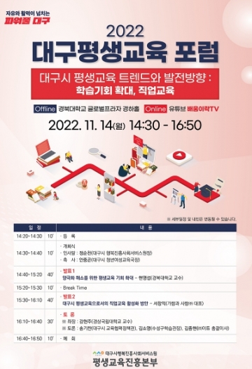 [가람플러스] 대구시행복진흥사회서비스원 평생교육진흥본부는 지역 평생교육 트렌드와 발전방향을 모색하기 위한 ‘2022 대구평생교육포럼’을 오는 14일 오후 2시30분, 경북대 글로벌프라자(1층 경하홀)와 유튜브 방송(배움이락TV)에서 온오프라인 동시 진행한다고 10일 밝혔다.