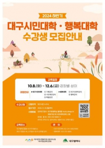 대구광역시행복진흥사회서비스원(이사장 배기철이하 대구행복진흥원)은 2024년도 하반기 ‘대구시민대학·행복대학’ 수강생을 10월 2일부터 선착순 모집한다.