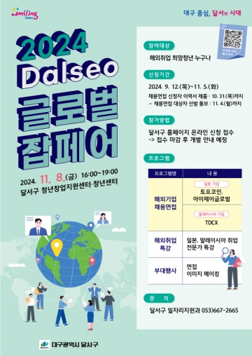 이태훈 달서구청장은 “해외취업을 희망하는 청년들이 '2024년 Dalseo 글로벌 잡페어'를 통해 해외취업의 가능성을 확인하고 글로벌 커리어의 첫 발을 내딛길 바란다"며 "앞으로도 청년들이 글로벌 무대에서 역량을 펼칠 수 있도록 실질적인 지원을 아끼지 않을 계획"이라고 말했다.