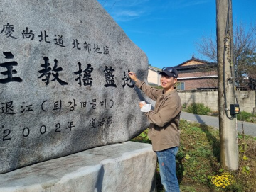 상주시 함창읍으로 귀촌한 조각예술가 이성규(28세) 씨가 경북 북부지역 천주교 전래 요람인 퇴강공소 인근 표지석을 세척·복원,