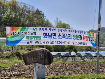 상주시 주민주도형 마을리빙랩이 인구소멸 지방도시의 새로운 활로를 찾아가고 있는 가운데, 상주시 화남면 소곡1리에 ‘로컬과 혁신이 공존하는 우리 마을만들기’ 현장 방문을 환영하는 플래카드가 내걸렸다.
