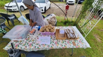 영오리 복지관 아이들이 만든 친환경 수세미를 수녀께서 판매하고 있다.