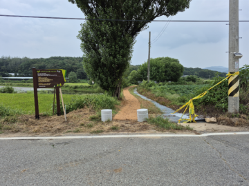 화동면 반곡1리 산책로 초입에 설치된 안내판과 볼라드. 몇 달 전 국민체조로 몸 풀기를 하며 산책로걷기 행사를 했었는데,