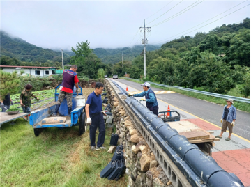 질구내마을에서 주민들이 직접 전통 돌담길을 조성하고 있다. 주민들이 돌과 기와를 이용해 정성스럽게 돌담을 쌓고 있으며, 트럭과 장비를 활용해 시공 작업이 완료되고 있다.